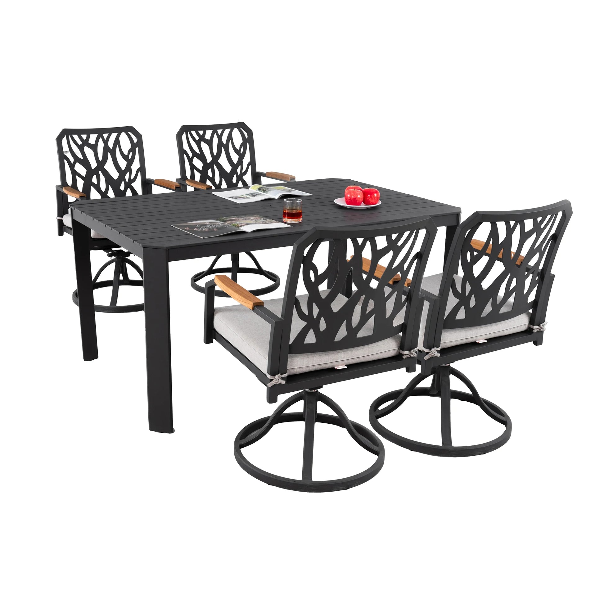 Transform your patio or courtyard into a sophisticated dining area with this modern 5-piece aluminum set. Designed for comfort and resilience, it features swivel rocker chairs and a sleek rectangular table ideal for outdoor meals, celebrations, and relaxing evenings.