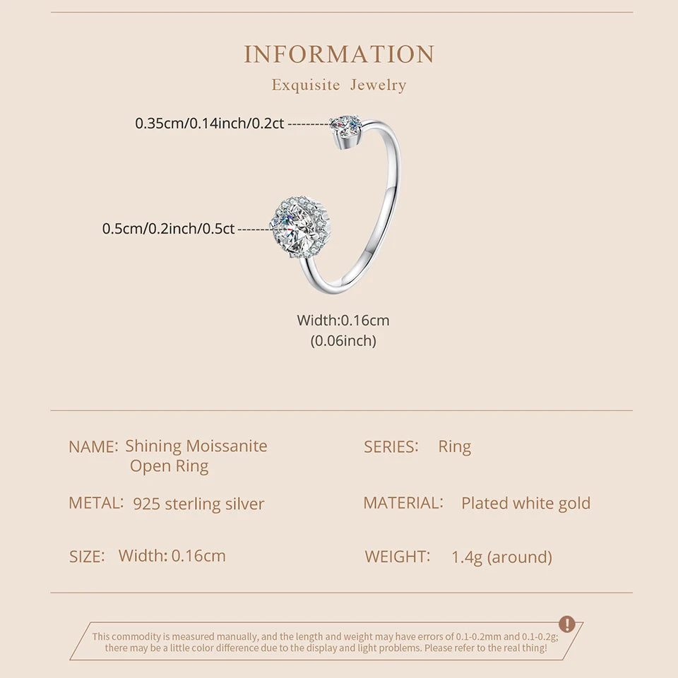 Adjustable Moissanite Open Ring – 925 Sterling Silver with White Gold Plating, 0.7CT D Color VVS1 Stones for Women