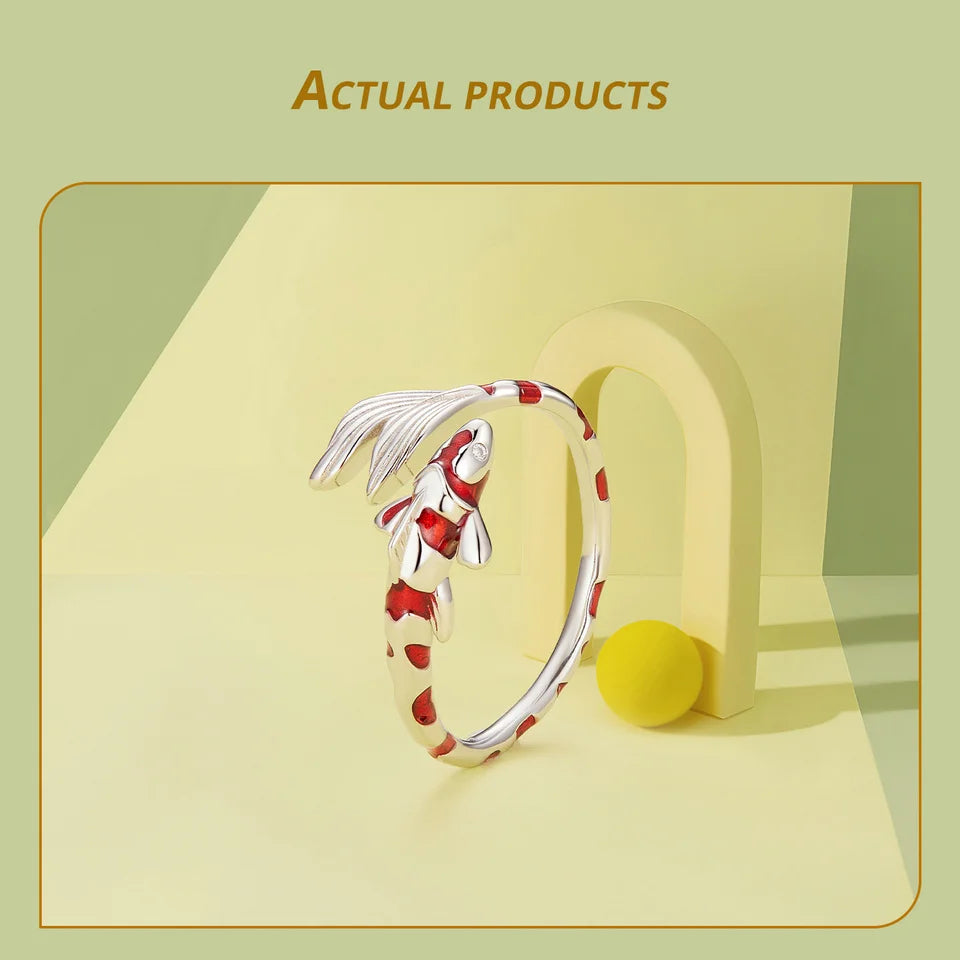 Adjustable Red Koi Fish Ring in 925 Sterling Silver – Lucky Animal Cocktail Ring with Zircon Detail