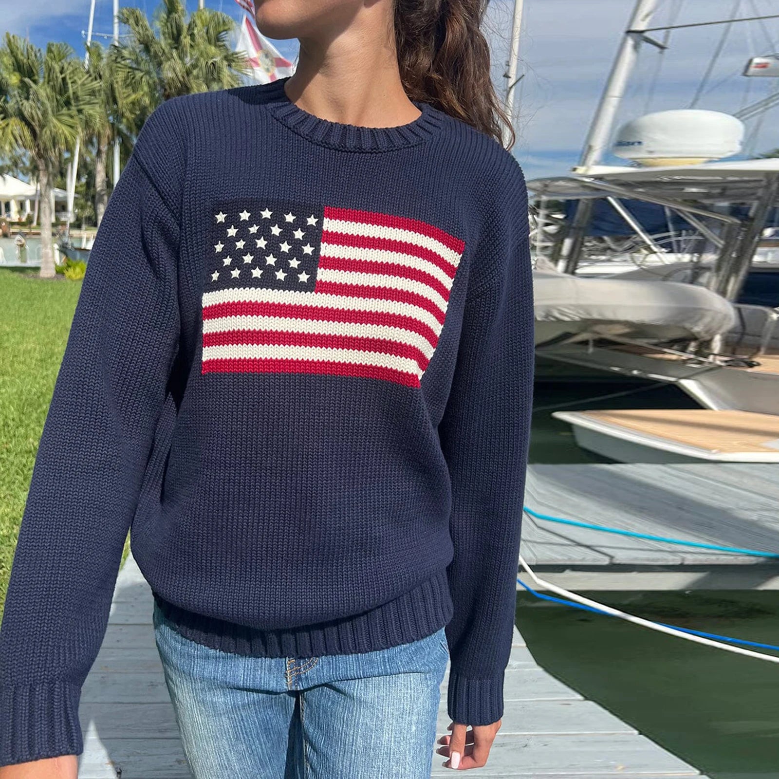 Women's American Flag Knit Sweater – Long Sleeve Crew Neck Loose Fit Pullover for Autumn Winter Casual High Street Style