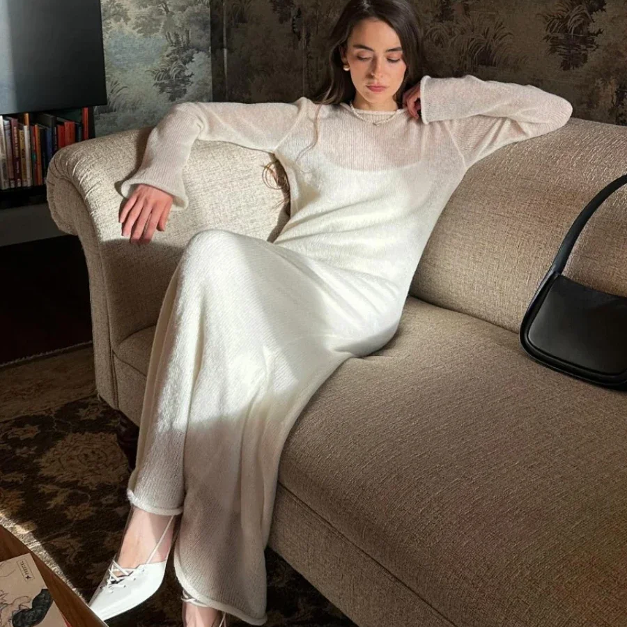 This knit two-piece set effortlessly blends comfort and style. With a relaxed long-sleeve sweater layered over a chic camisole skirt, it’s the perfect match for cool weather days, whether you're out for errands or enjoying a cozy evening.