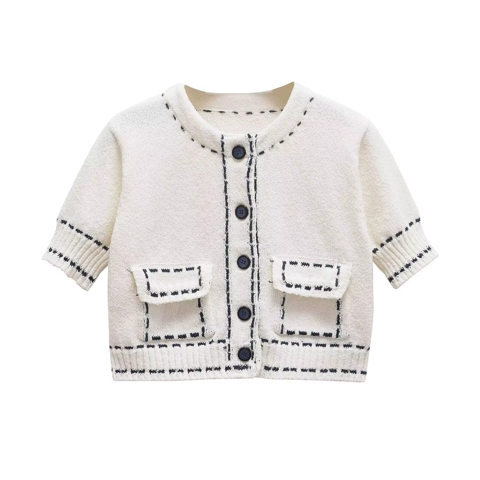 Women's Handmade Knitted Cardigan Coat – Short Sleeve Patchwork Contrast Color Sweater with Pockets