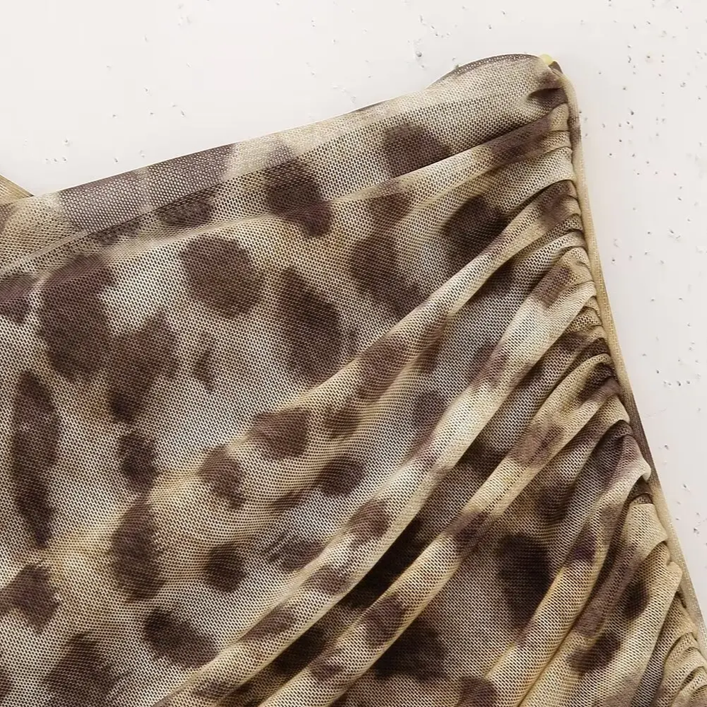 Women's Strapless Leopard Print Pleated Mesh Halter Top – Backless Slim Fit Cropped Summer Blouse