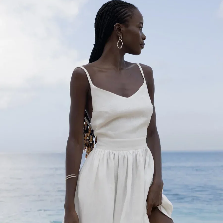 Women's V-Neck Cotton A-Line Beach Dress – Sleeveless Vintage Fit and Flare Sling Dress for Spring and Summer