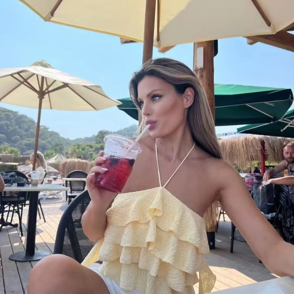 Summer Women's Yellow Textured Ruffle Halter Crop Top with Streamers